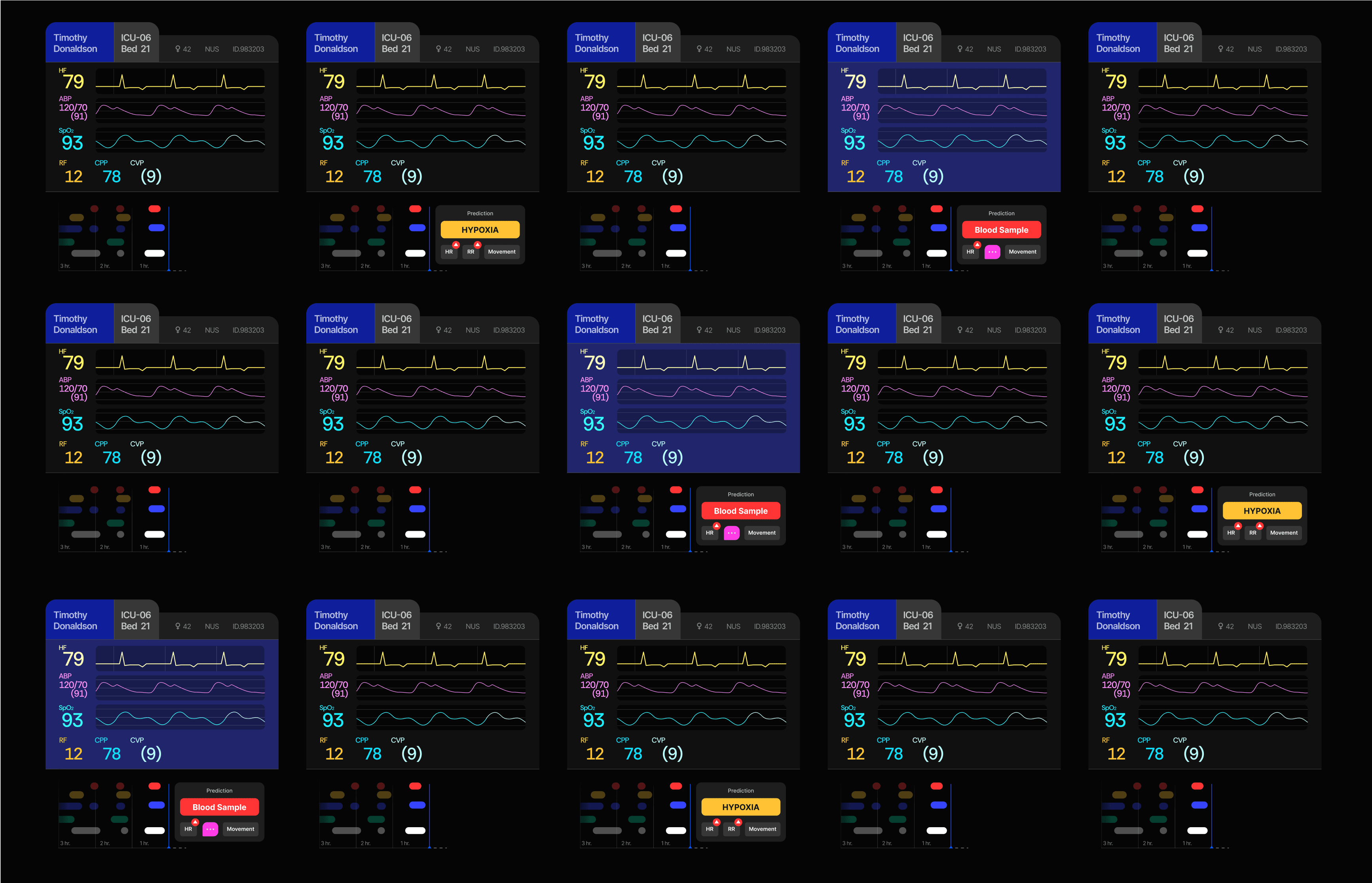 Traditional vital windows showed vitals and alarms in isolation, offering limited context. The reimagined design adds a timeline graph to reveal trends over time and an AI prediction panel to flag risks like hypoxia before they occur.